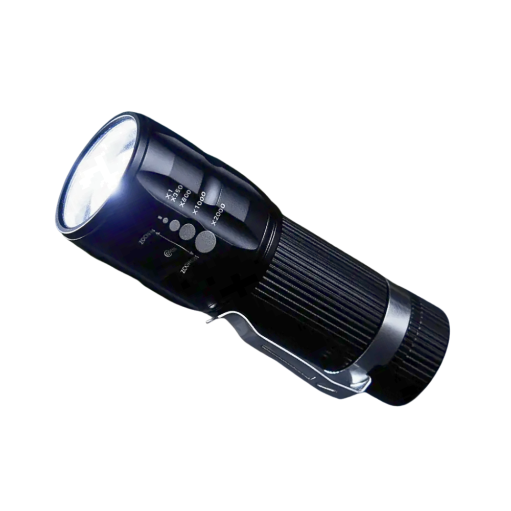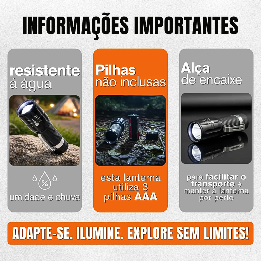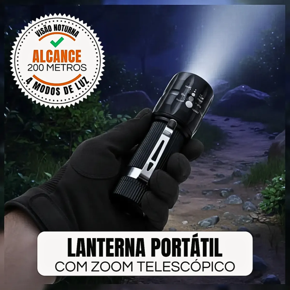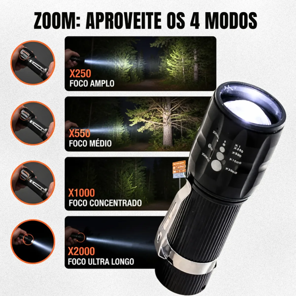 -Zoom Telescópico Ajustável: Permite ajustar o foco da luz, alternando entre um feixe amplo para iluminar grandes áreas e um feixe concentrado para alcançar objetos distantes.