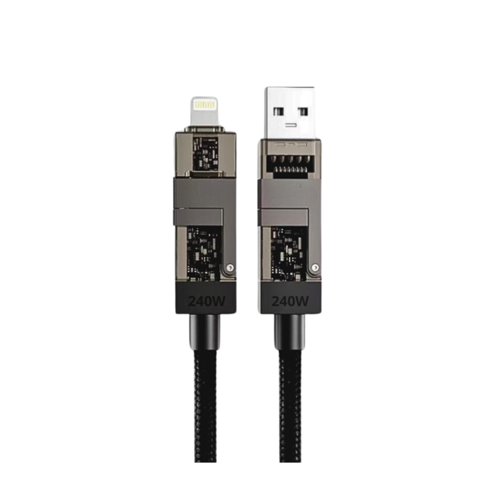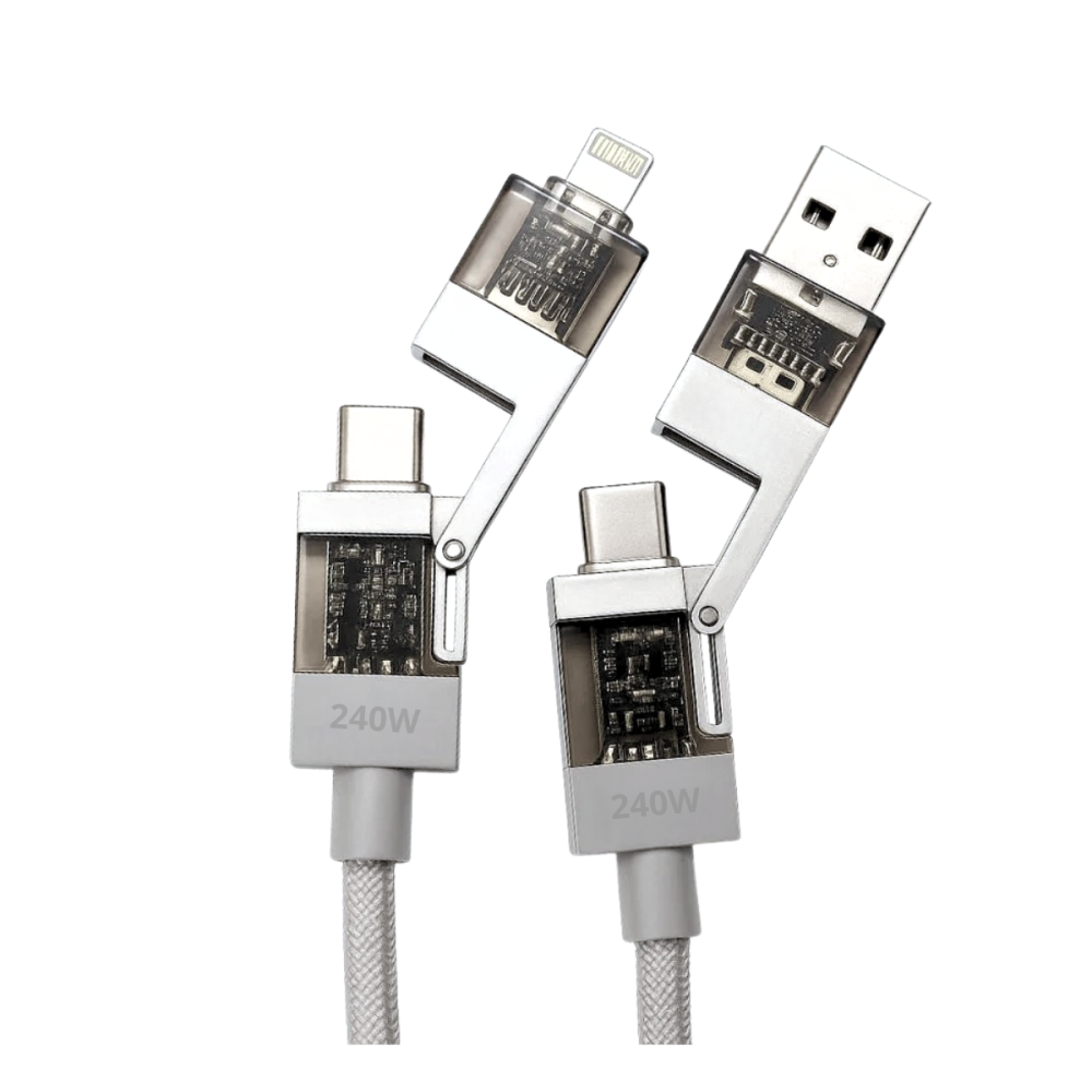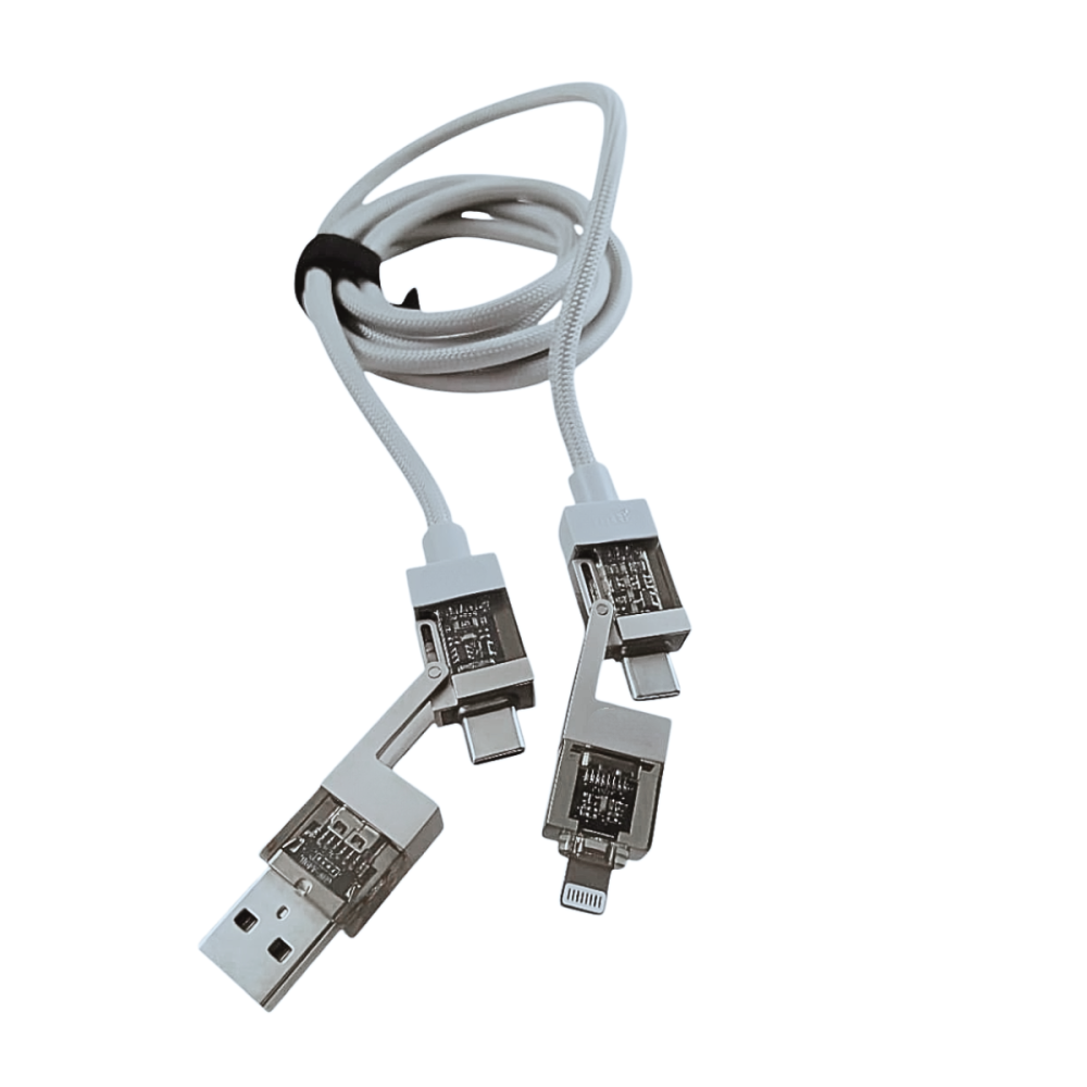 O Cabo de Dados 4 em 1 é a solução definitiva para suas necessidades de carregamento e transferência de dados, consolidando múltiplas conexões em um único cabo de 1,20 metros.