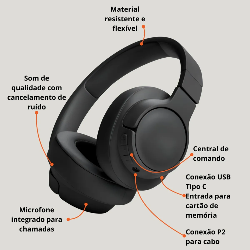 -Conforto: O design over-ear com almofadas macias foi pensado para sessões de áudio prolongadas.