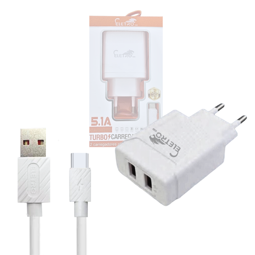 -- Fonte Carregador Turbo 5.1A com 02 Portas USB Cabo TIPO-C de 1 Metro Eletromex EL-4003-TY