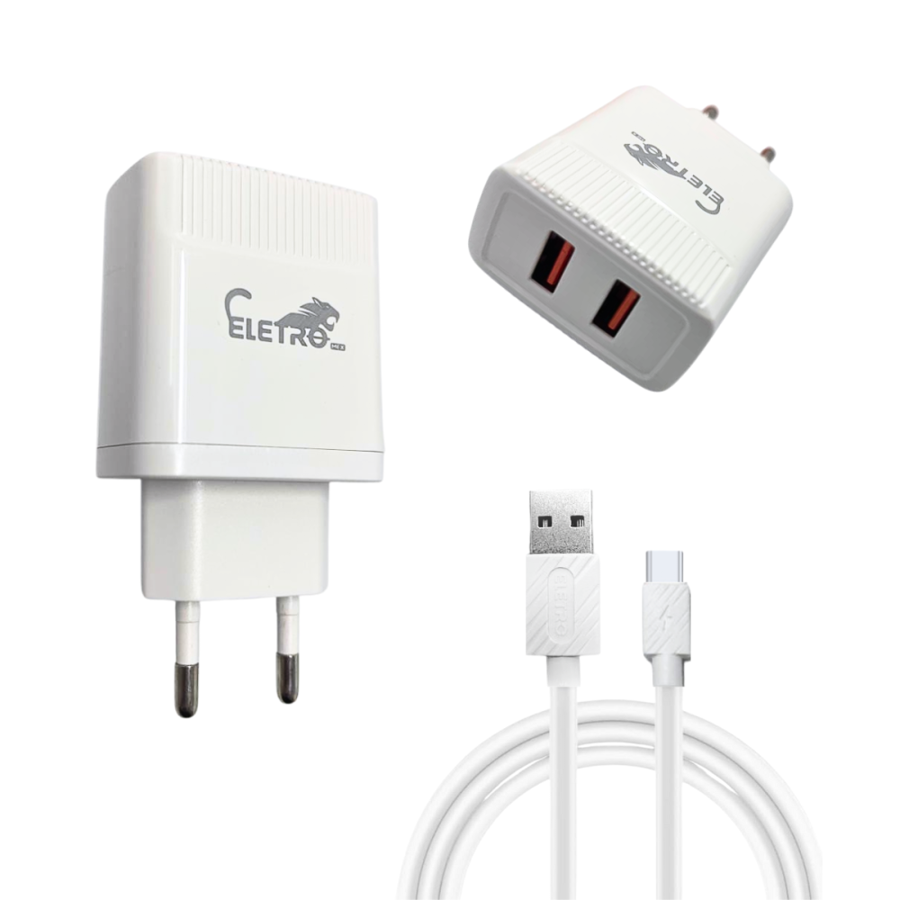 O Carregador EL-4003-TY é um kit carregador de parede completo, composto por uma fonte de alimentação com duas portas USB e um cabo Tipo-C avulso, projetado para oferecer carregamento rápido e eficiente.
