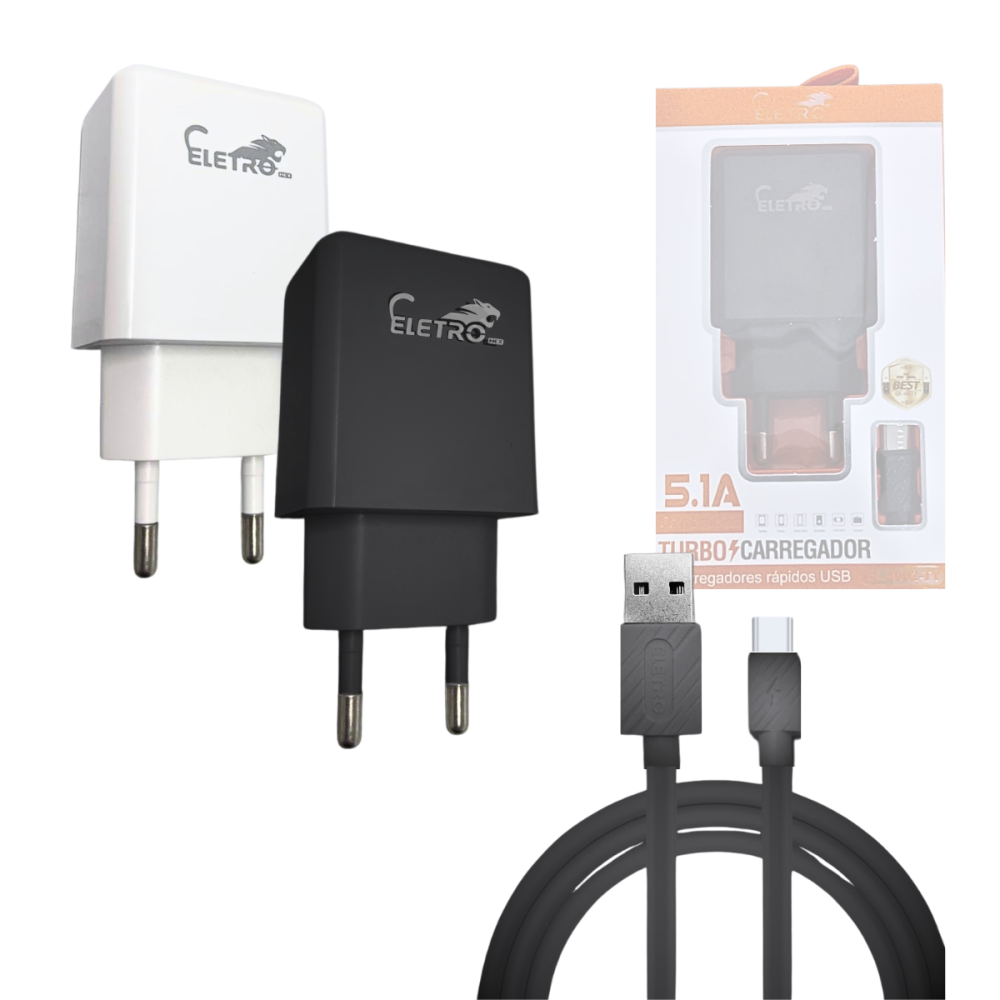 -- Fonte Carregador Turbo 5.1A com 02 Portas USB Cabo TIPO-C de 1 Metro Eletromex EL-4002-TY