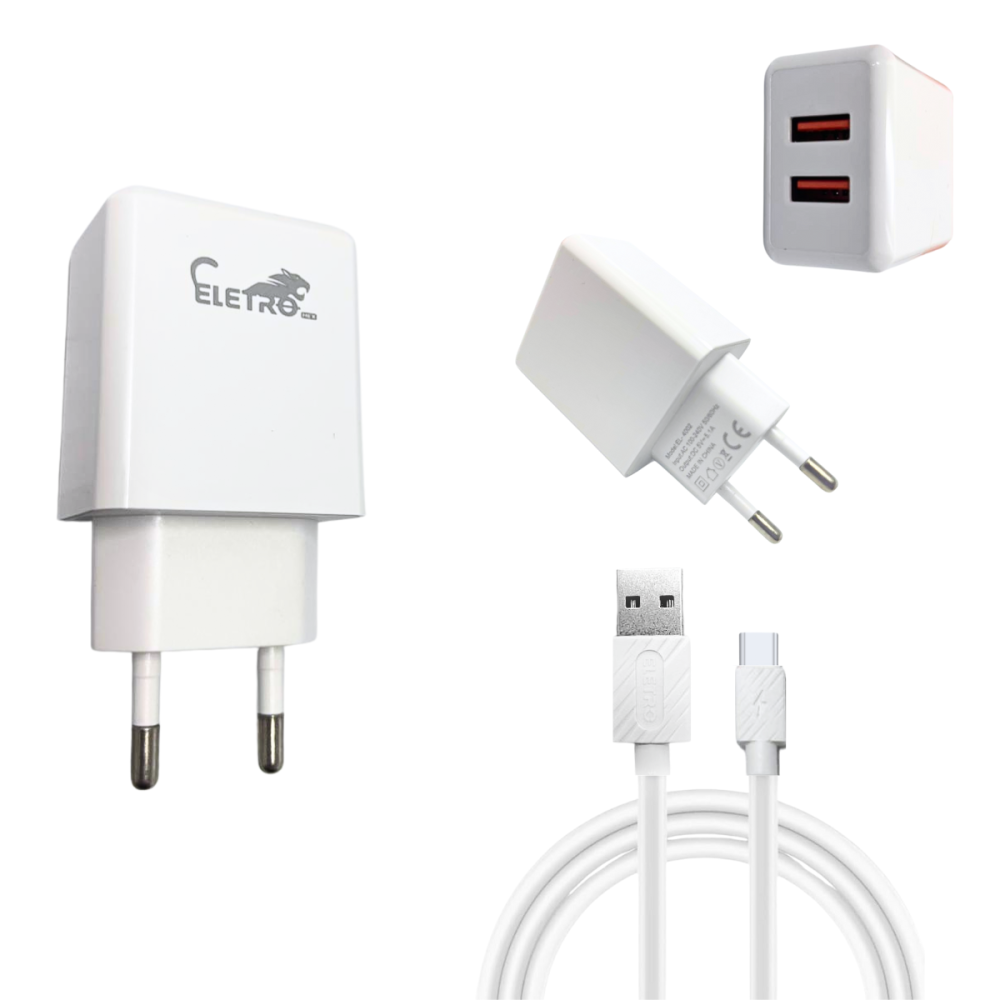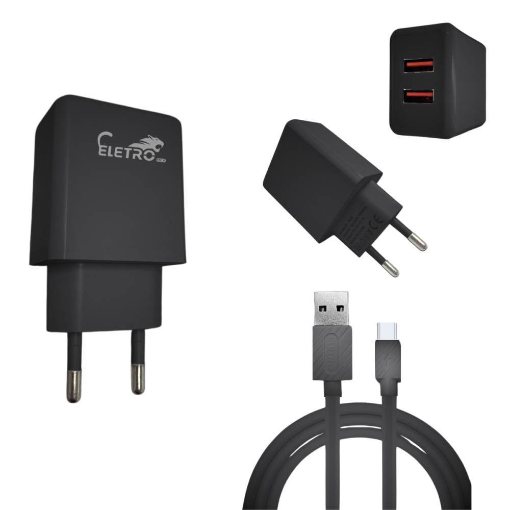 O Carregador EL-4003-TY é um kit carregador de parede completo, composto por uma fonte de alimentação com duas portas USB e um cabo Tipo-C avulso, projetado para oferecer carregamento rápido e eficiente.