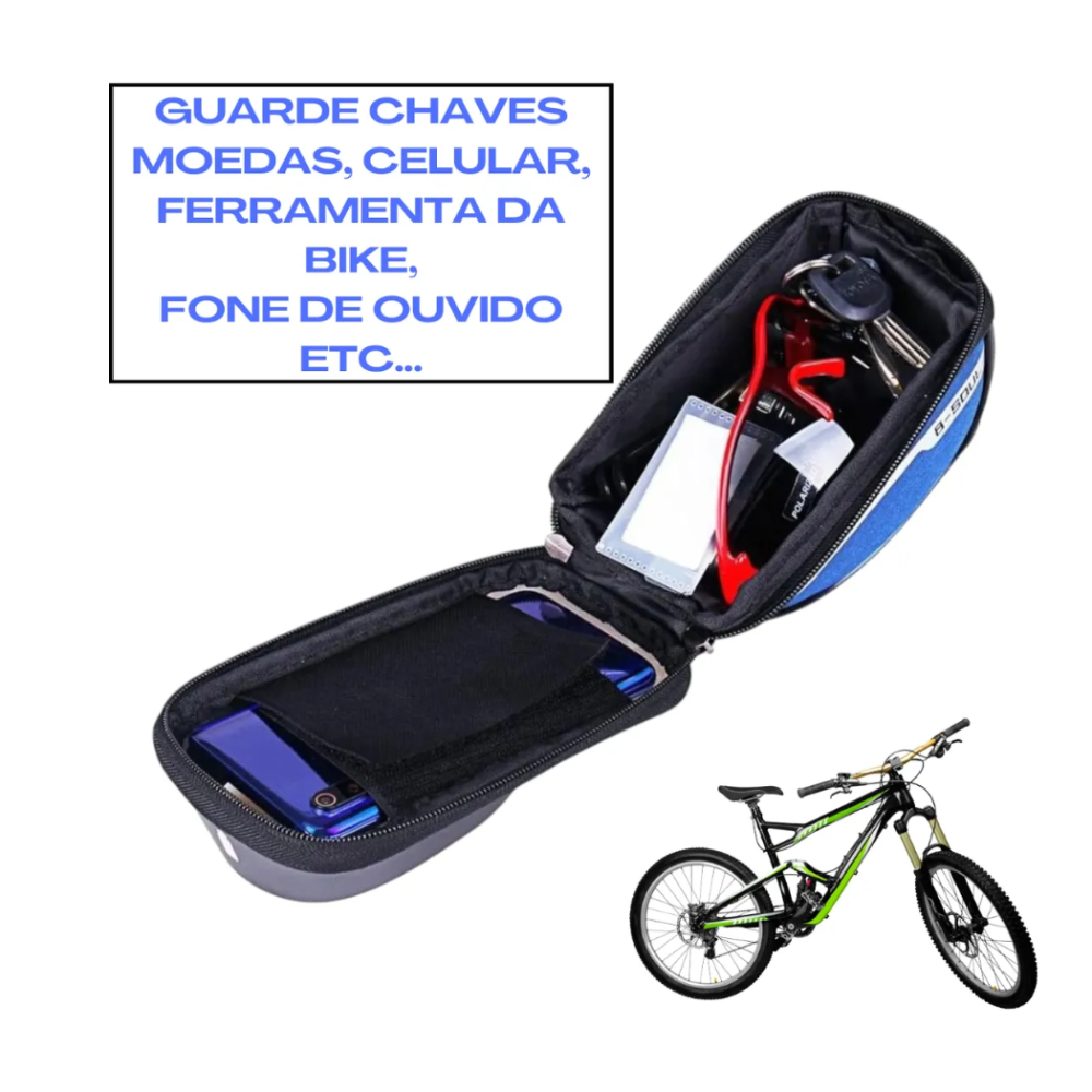 Seu grande diferencial é o suporte para celular com capa transparente sensível ao toque, que permite utilizar o smartphone para GPS, aplicativos de ciclismo ou música sem precisar retirá-lo da bolsa. Além disso, é impermeável, protegendo seus itens contra chuva, respingos e poeira.