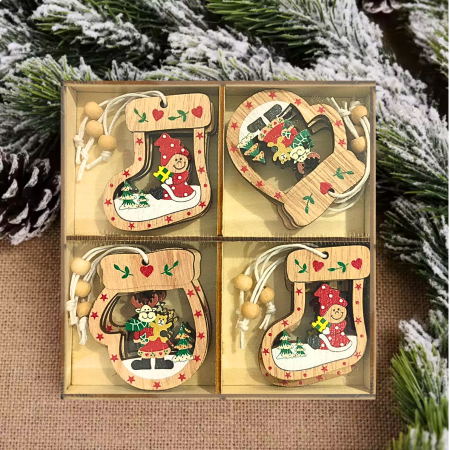 -Dimensões do Pingente (unidade): As dimensões exatas de cada peça (luva ou meia) são compatíveis com o tamanho da embalagem, sendo peças compactas, ideais como adornos de árvore, com medidas aproximadas de 5,50 x 5,50 cm por unidade.