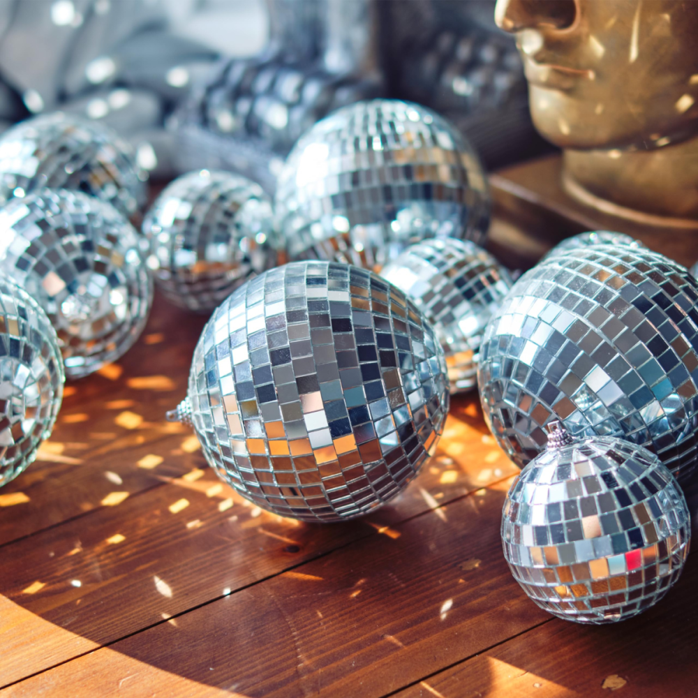 -Design: As bolas são cobertas por inúmeras facetas de espelho (pequenos quadrados reflexivos), que multiplicam a luz de forma vibrante.