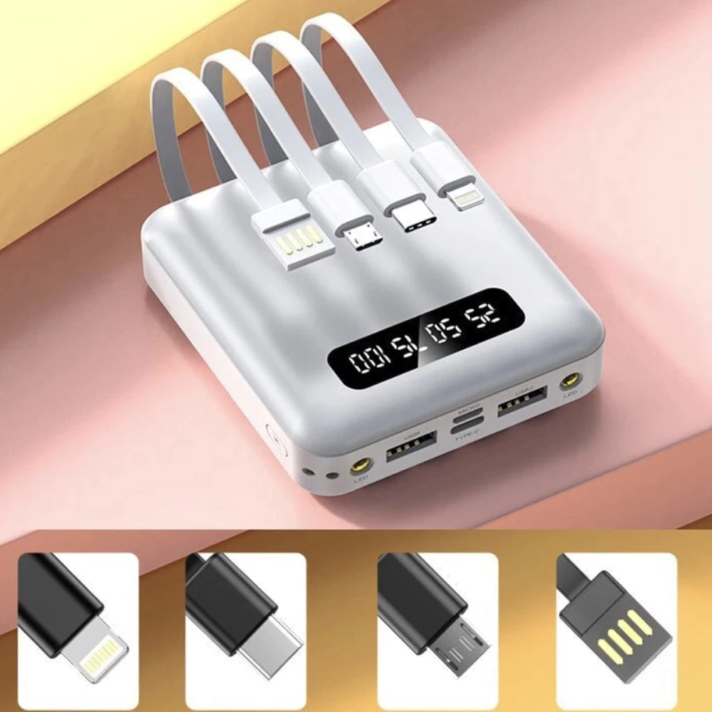 -Portas: Oferece múltiplas opções de entrada, como portas Conexão V8, Tipo-C, Lightning e USB para recarga do próprio Power Bank.