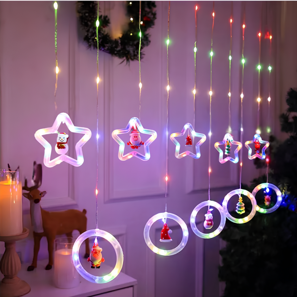 O modelo AL-4870 é um conjunto de luzes decorativas LED indicado para uso em decorações natalinas e ambientes festivos. O produto é confeccionado em estilo cortina, com fios transparentes e iluminação multicolorida. Possui miniaturas temáticas de Papai Noel, árvore de Natal e boneco de neve, que complementam a decoração com detalhes visuais característicos da época.