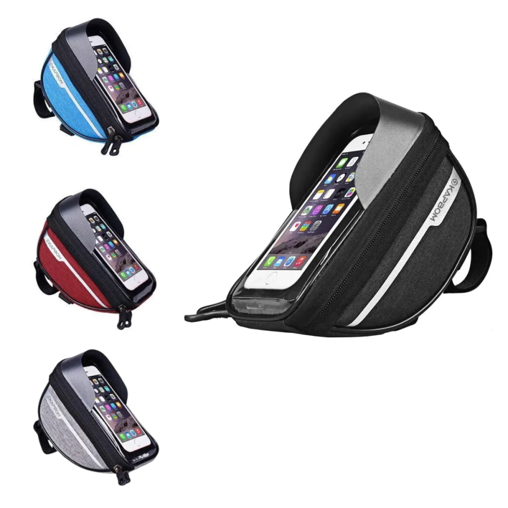 Seu grande diferencial é o suporte para celular com capa transparente sensível ao toque, que permite utilizar o smartphone para GPS, aplicativos de ciclismo ou música sem precisar retirá-lo da bolsa. Além disso, é impermeável, protegendo seus itens contra chuva, respingos e poeira.