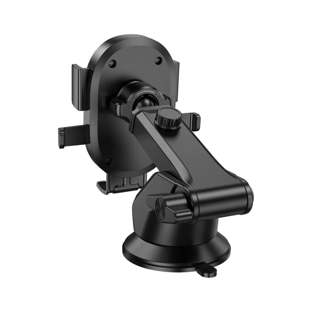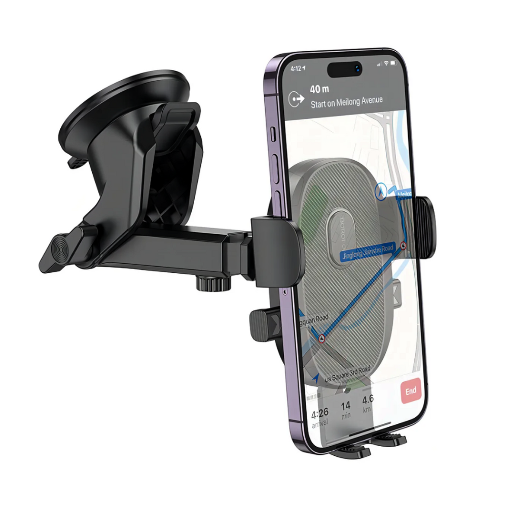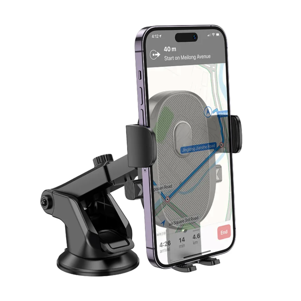 Com design moderno e funcional, o suporte possui sistema de ventosa com trava de fixação e rotação 360°, permitindo ajuste de ângulo conforme a necessidade do motorista.