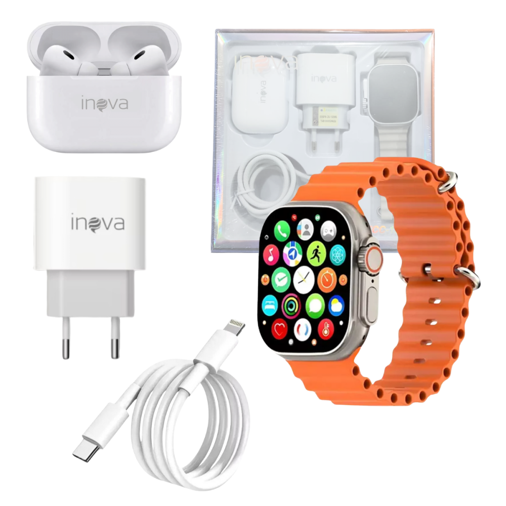 KIT Smartwatch 49mm + Fone Ouvido + Fonte TIPO-C + Cabo Lightning INOVA WFFCC-12756 (Ondulada)