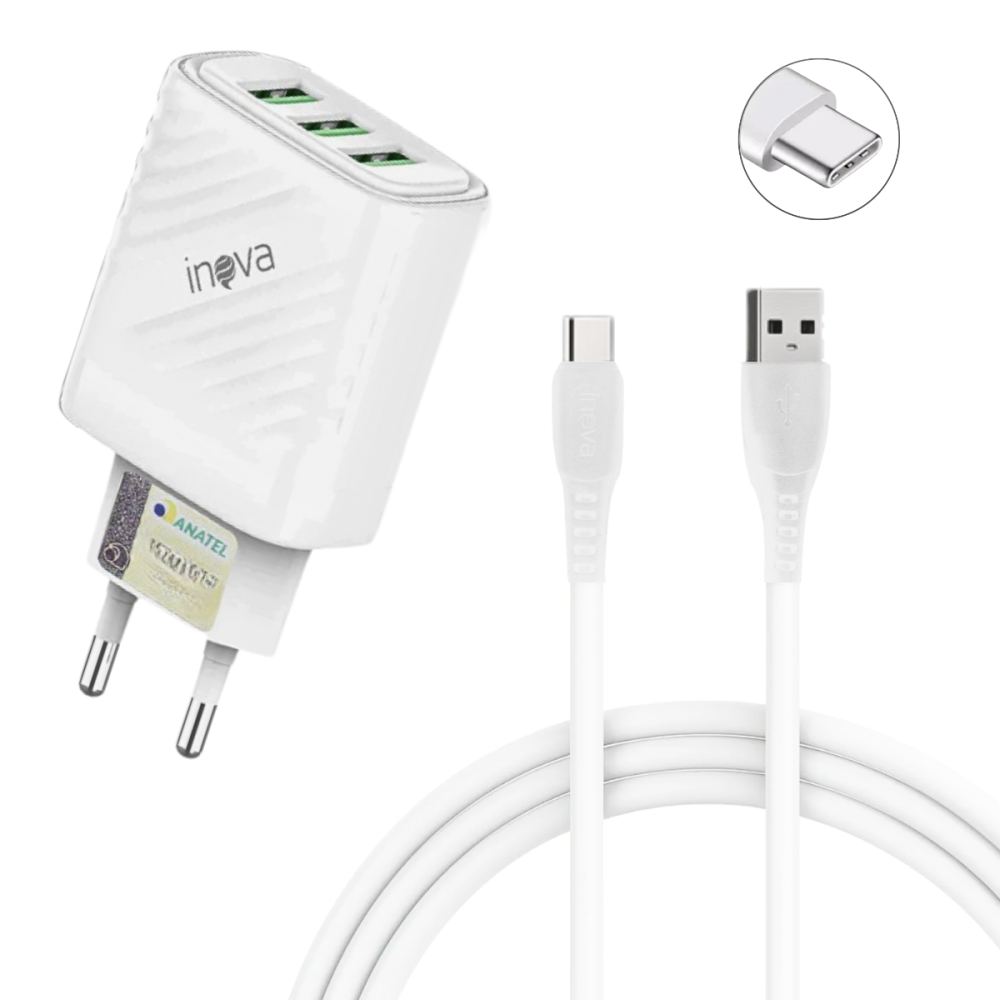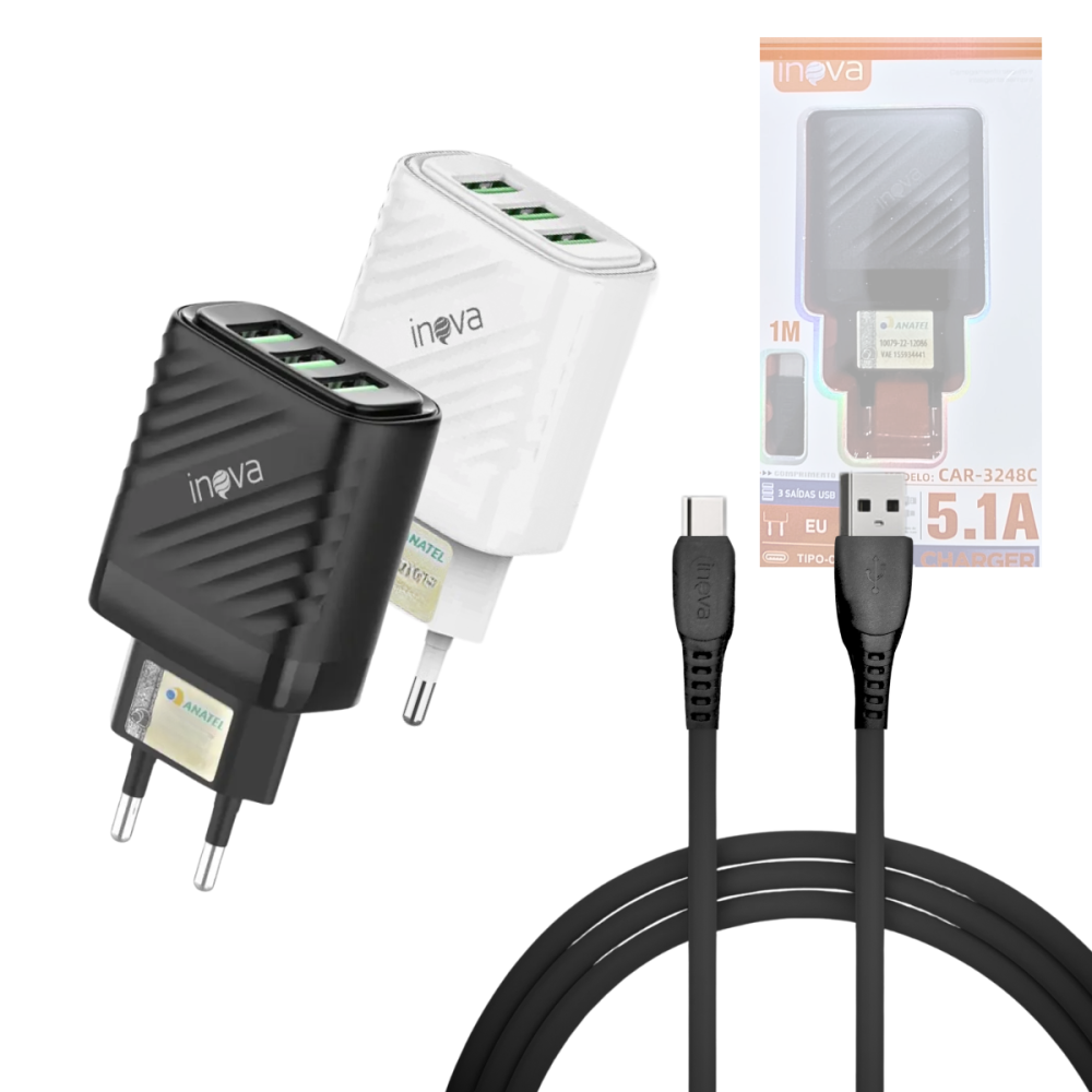 Carregador Completo TURBO 03 Entradas USB 5.1A com Cabo TIPO-C de 1 Metro INOVA CAR-3248C