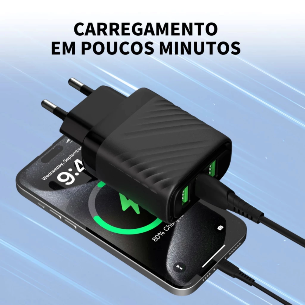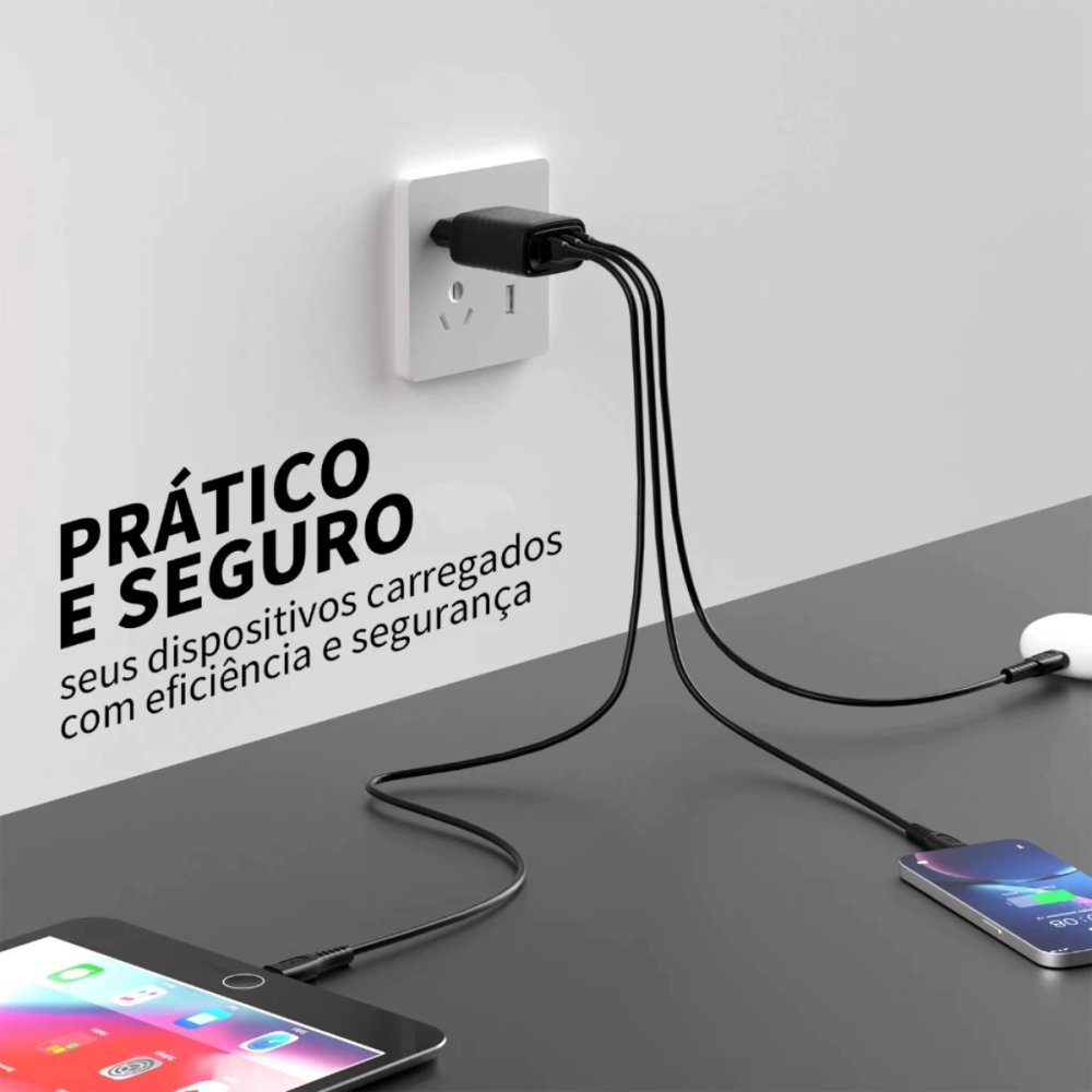 -Carregamento turbo para até 4 dispositivos simultâneos (3 USB + 1 Cabo Tipo-C)