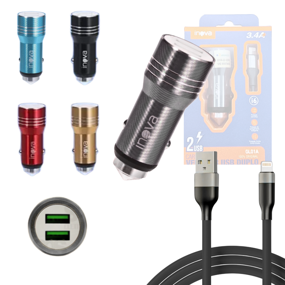 Carregador Veicular TURBO com 02 Portas USB Cabo Lightning de 1 Metro INOVA GL01A