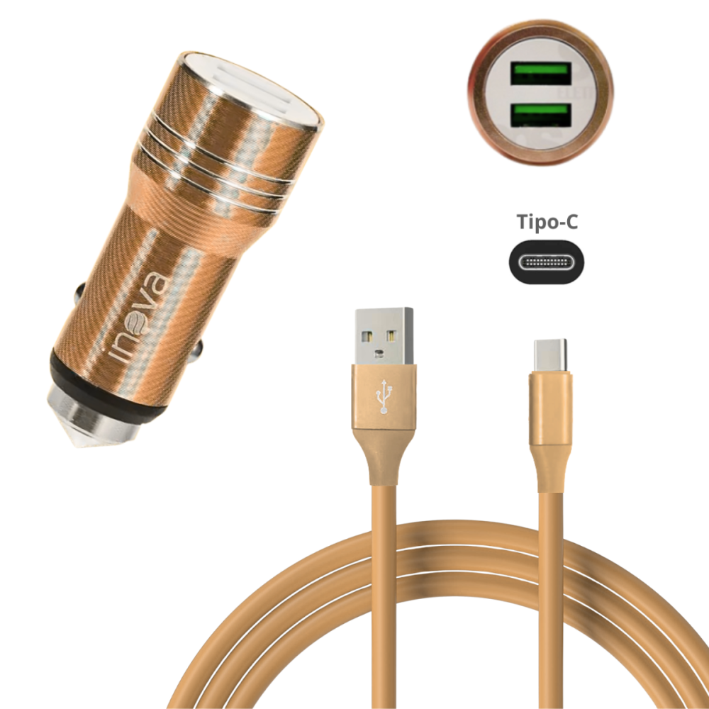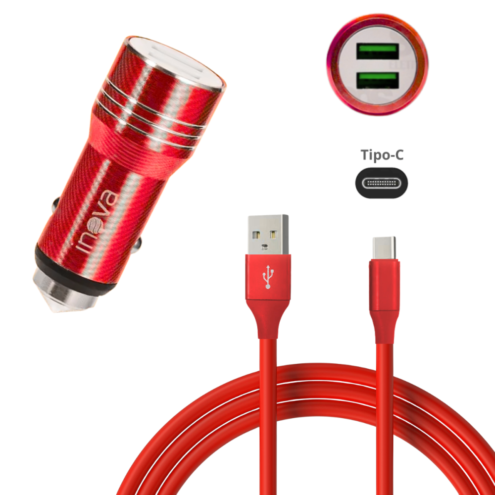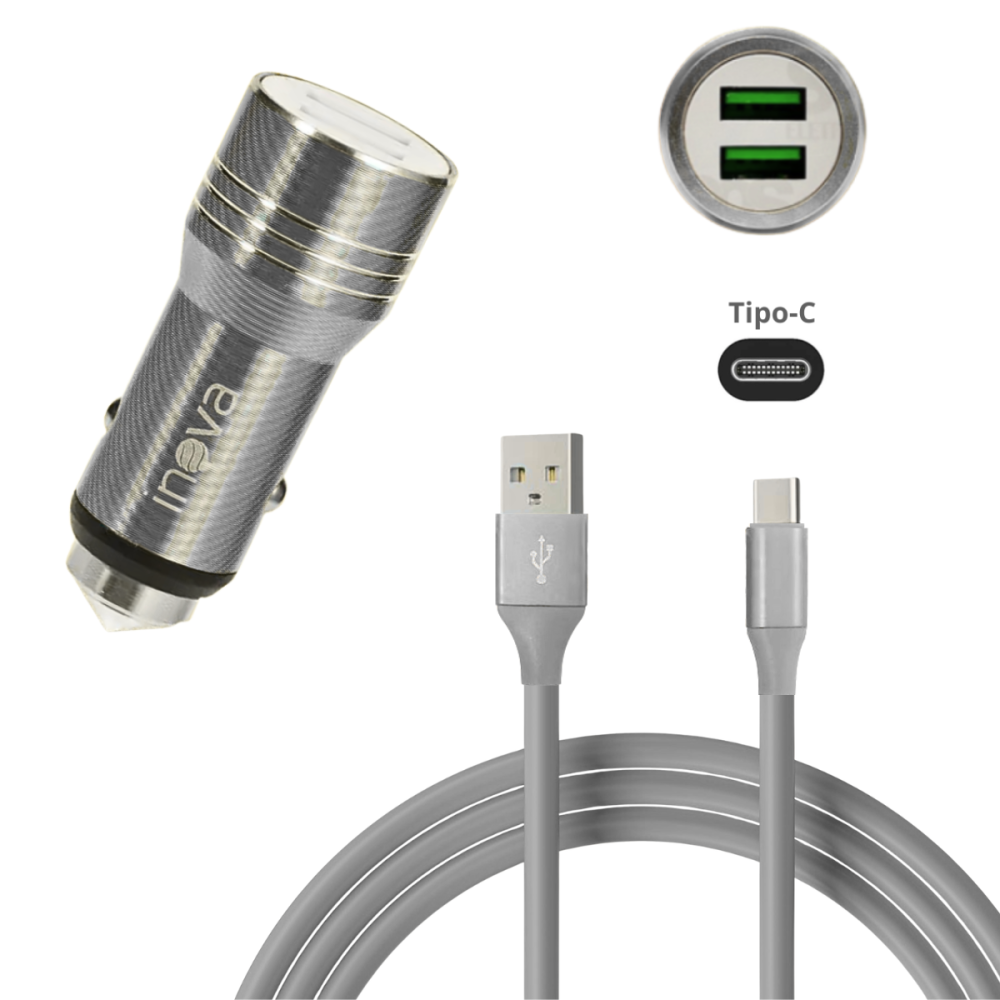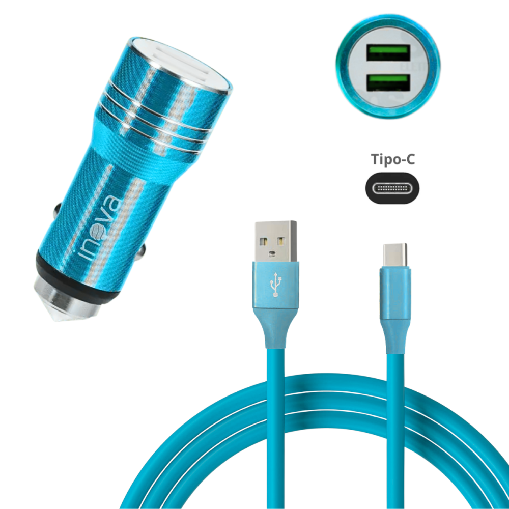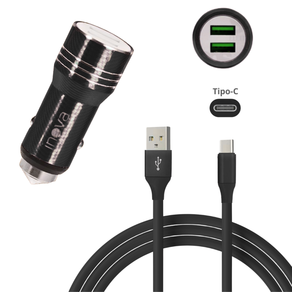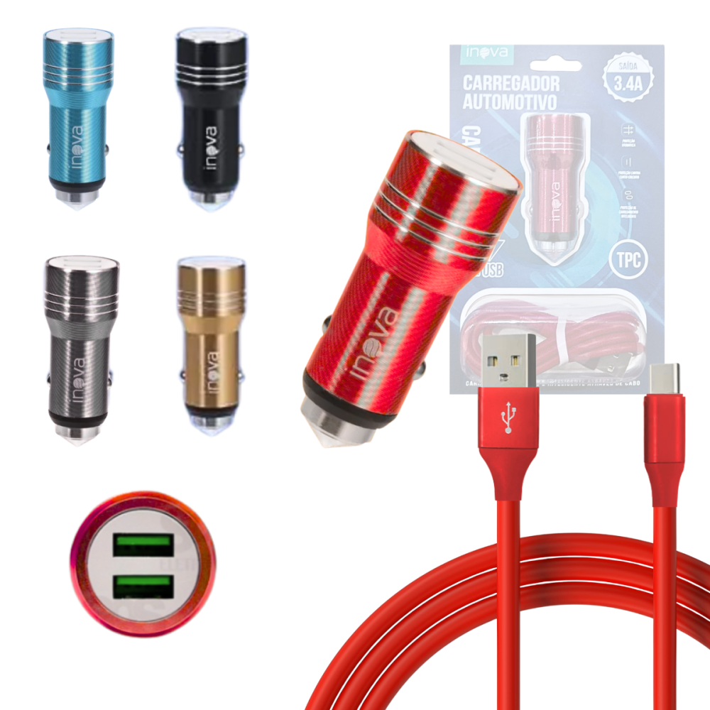 Carregador Veicular TURBO com 02 Portas USB Cabo TIPO-C de 1 Metro INOVA CAR-8357