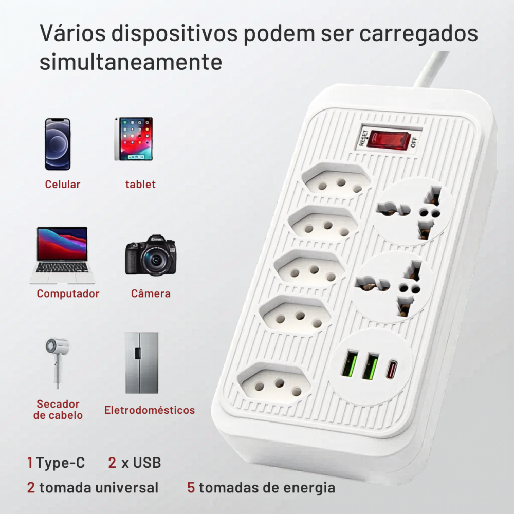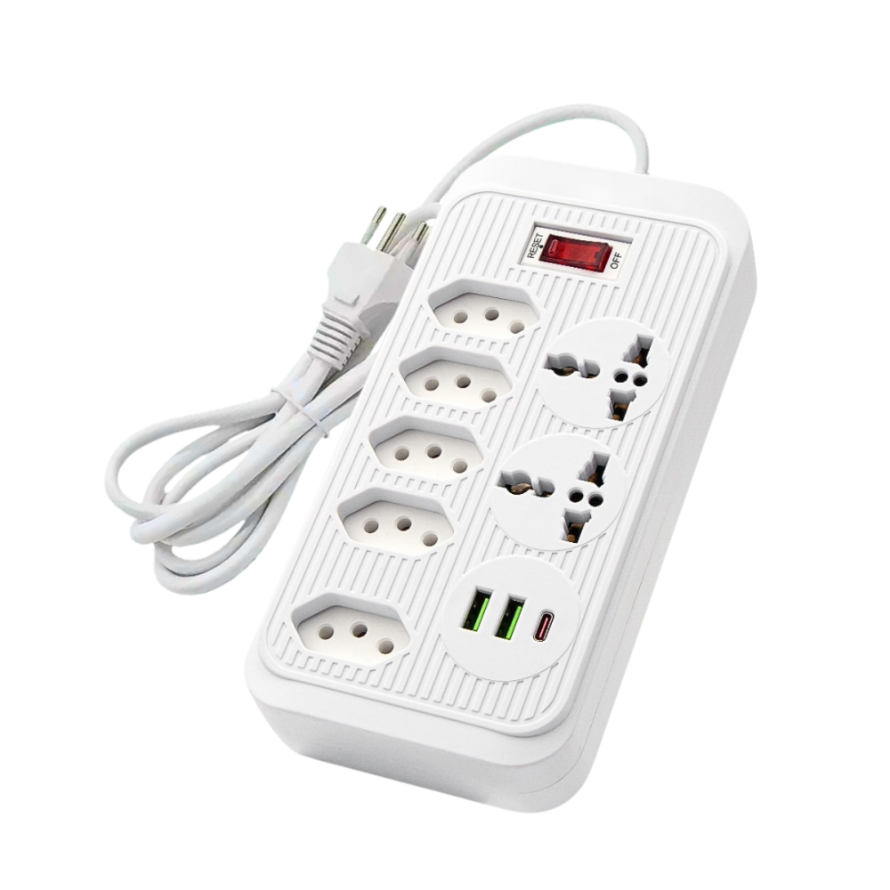 -Quantidade de Tomadas: 7 tomadas (sendo 5 no padrão brasileiro NBR 14136 e 2 universais)